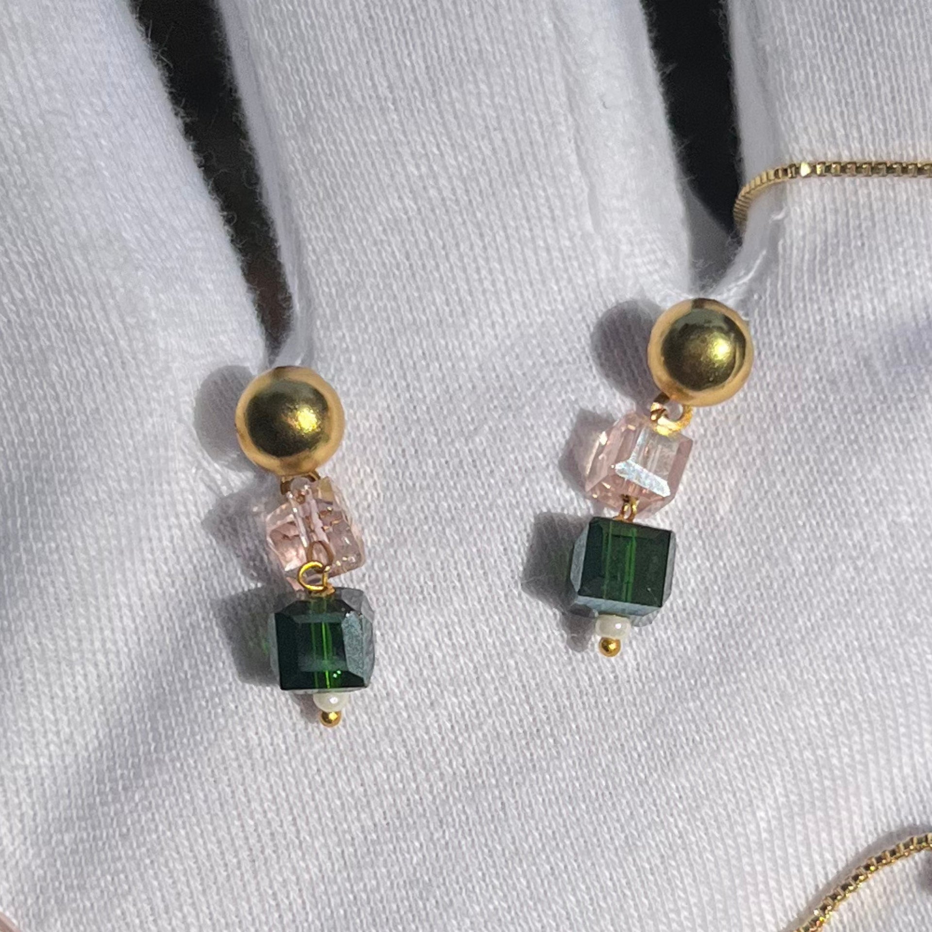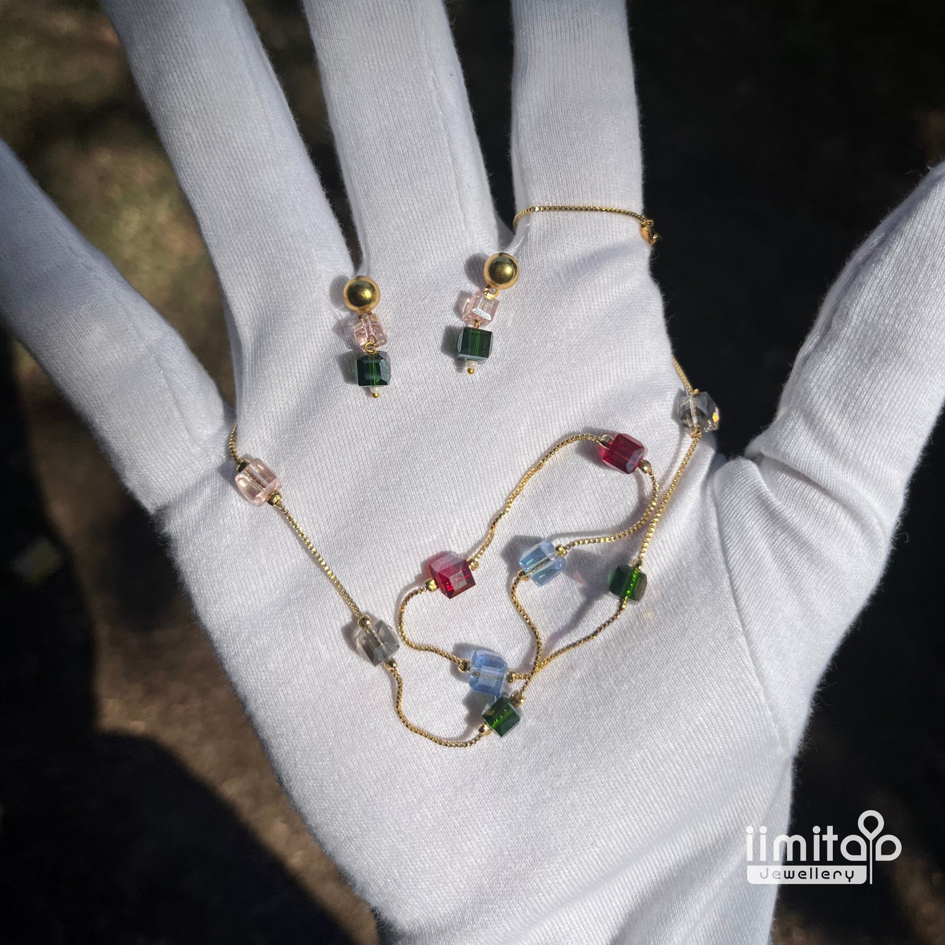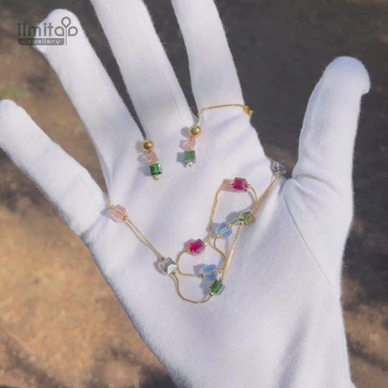Elevate your everyday style with our colorful cube bead necklace and matching earrings set. Crafted with imitation gold plating, this vibrant set features high-quality multicolored beads, carefully designed to bring a playful yet elegant touch to any outfit. The lightweight necklace is beautifully accented with cube-shaped beads in shades of green, pink, blue, and crystal, giving it a fresh, youthful look. The matching earrings perfectly complement the necklace, featuring dual-tone cube beads dangling from a polished gold-toned stud. Ideal for casual outings, festive occasions, or as a thoughtful gift, this imitation jewelry set offers the charm of real jewelry at an affordable price.