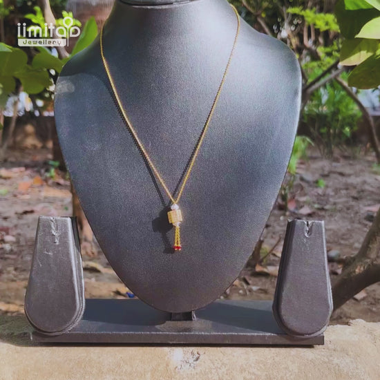 Add a touch of tradition with a trendy twist! This stunning imitation gold necklace features a uniquely textured cylindrical pendant embellished with shimmering details and delicate hanging tassels adorned with red bead accents.