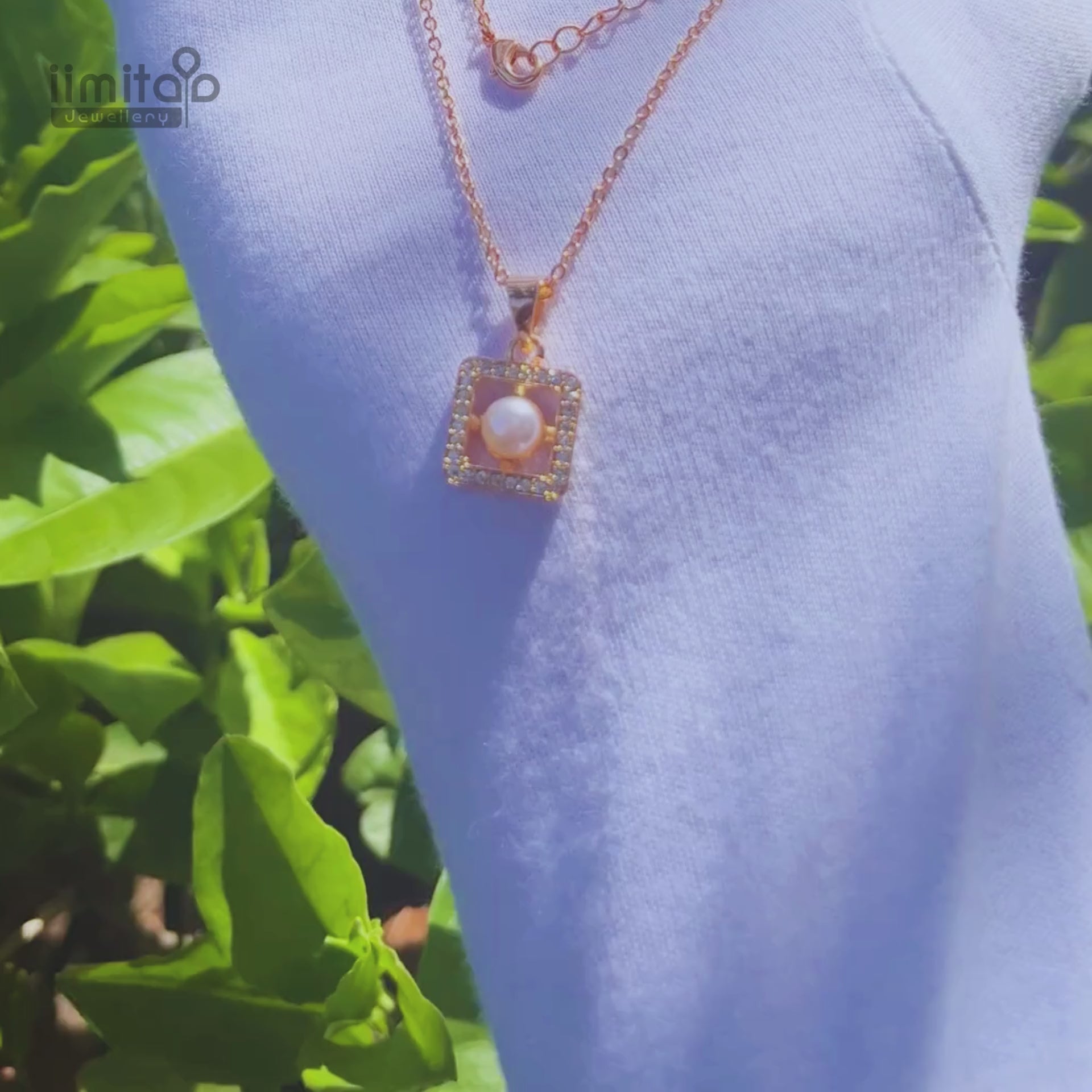 Rose Gold-Plated Imitation Pendant Necklace with Pearl Center & Square Frame