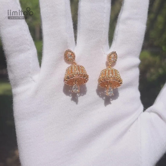 Bring timeless elegance to your jewelry collection with these luxurious gold-tone imitation jhumka earrings. Crafted from high-quality imitation metal, these earrings are beautifully embellished with dazzling white stones and feature a teardrop-shaped stud for a graceful touch. The intricate jhumka design with a sparkling drop stone inside adds movement and sophistication to your look. Ideal for weddings, festivals, parties, or adding a regal charm to your traditional outfits.