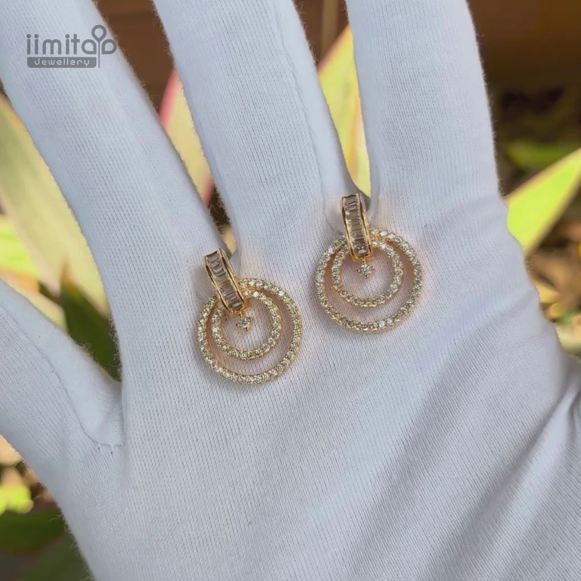 Elevate your style with these stunning imitation gold earrings, featuring a modern double-circle design adorned with sparkling cubic stones. A vertical baguette stone strip enhances the elegance, making them perfect for both everyday glam and special occasions.