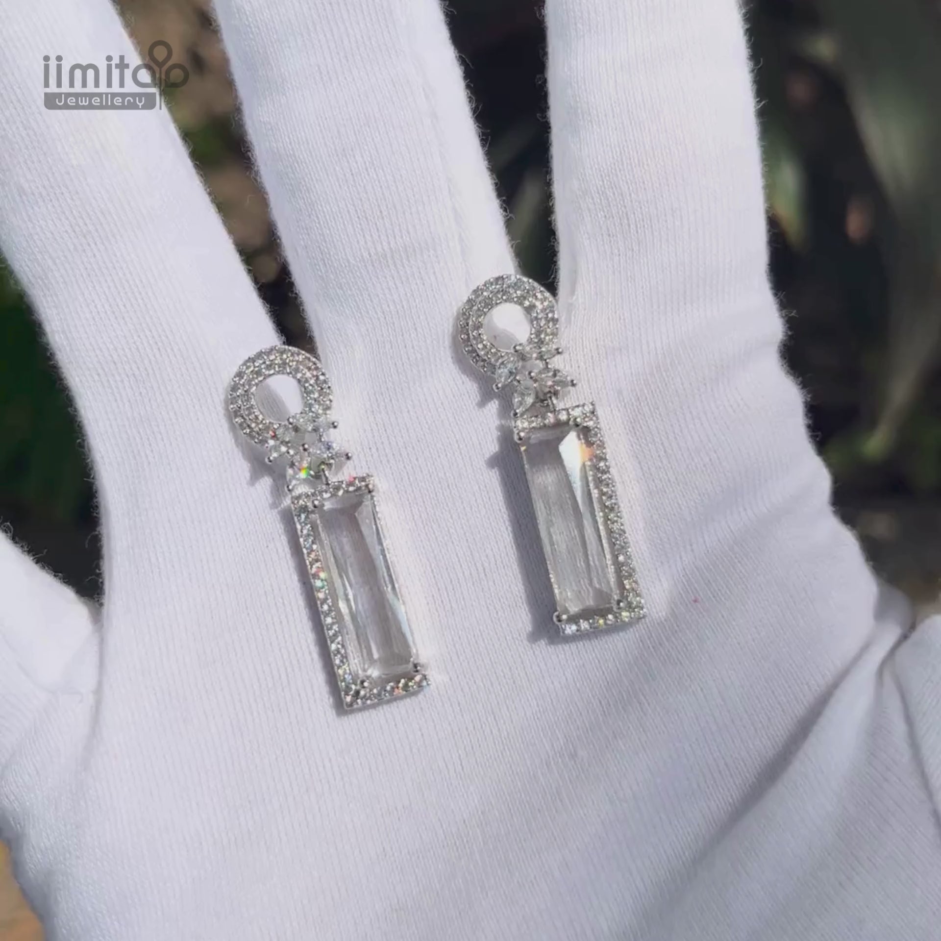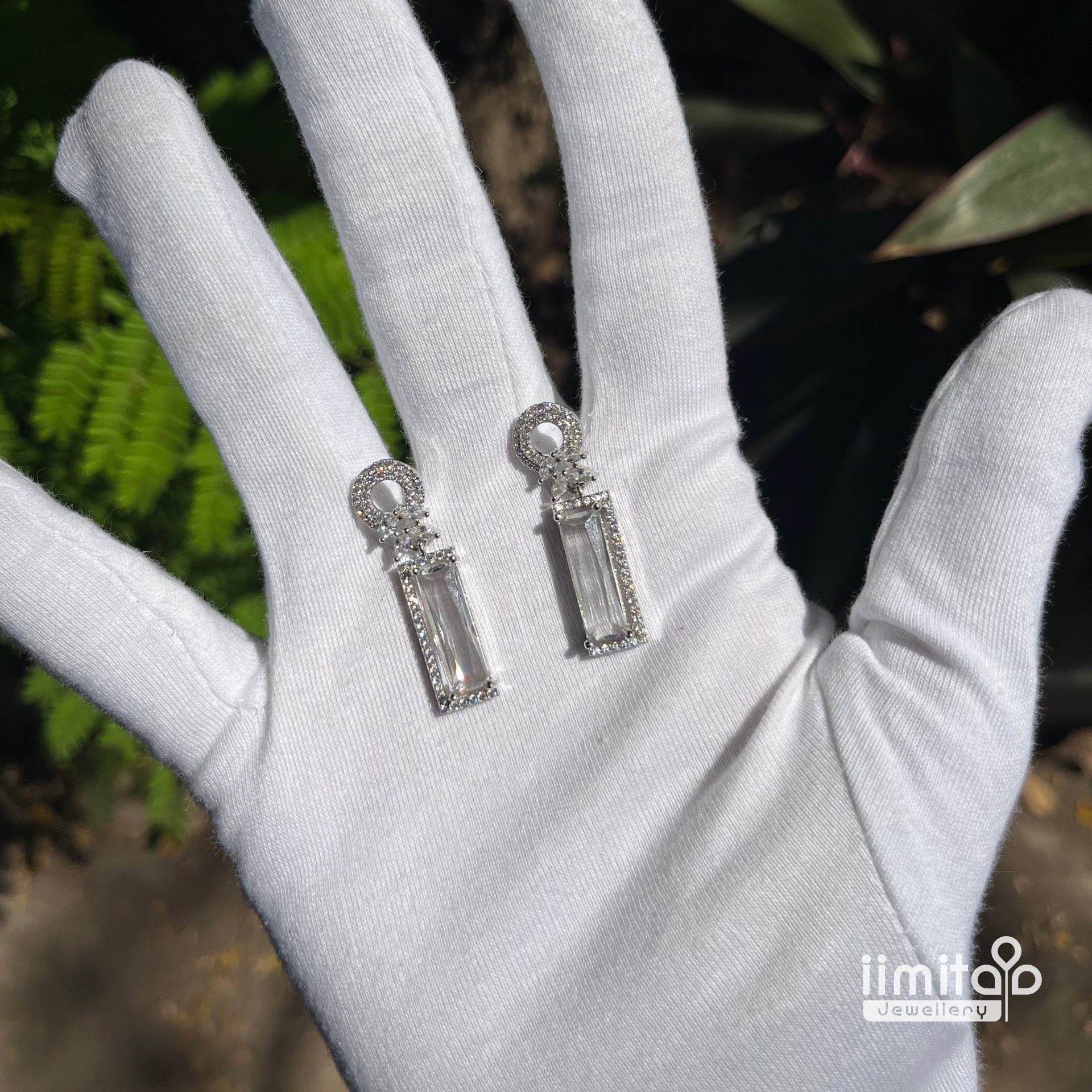 Add timeless elegance to your jewelry collection with these dazzling silver-tone imitation earrings. Featuring a sleek rectangular crystal drop framed by shimmering stones and a delicate round top design, these earrings capture the sparkle of fine jewelry with a modern twist. Ideal for special occasions, evening parties, or stylish everyday wear!
