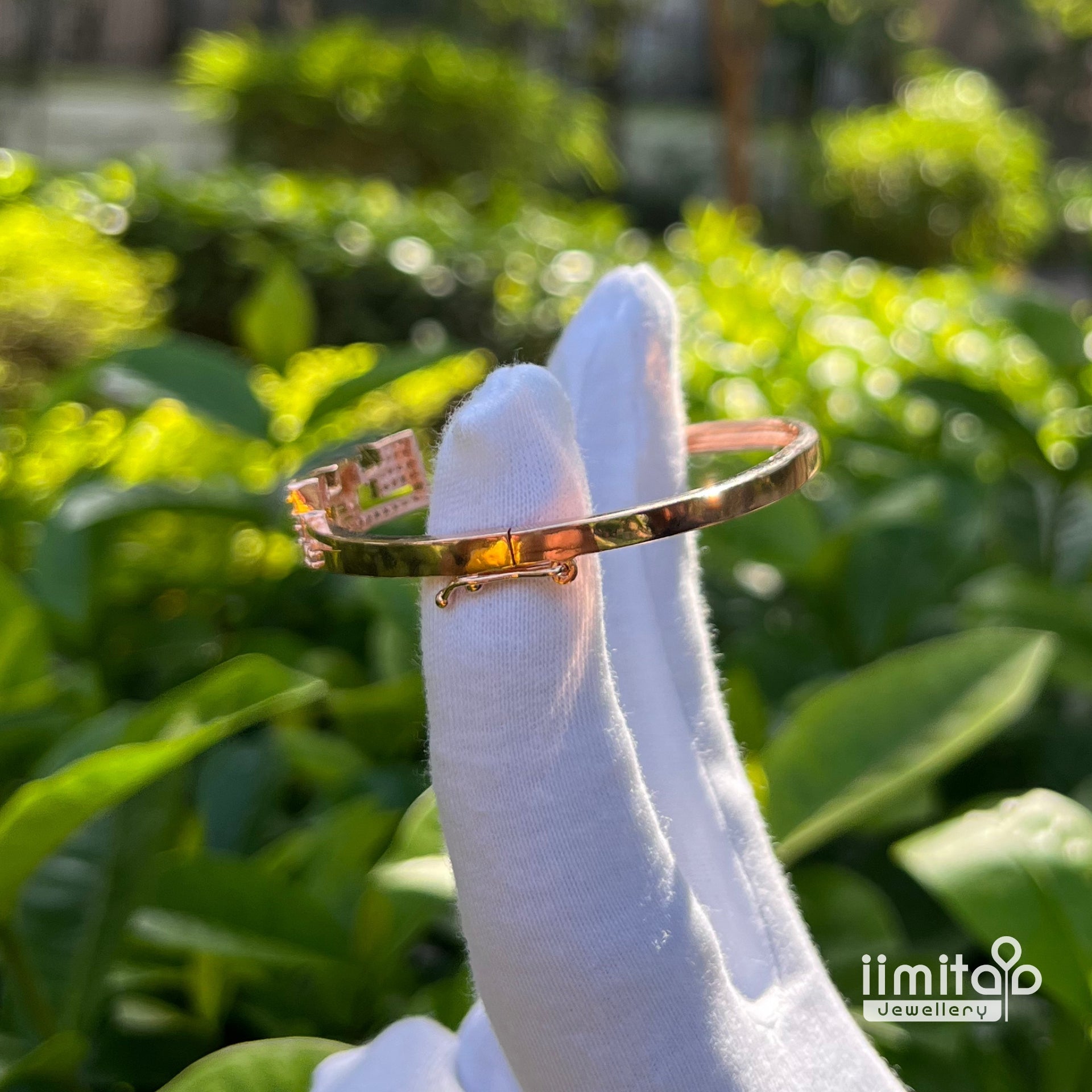 Add a bold statement to your collection with this contemporary imitation gold bangle. Designed with a striking square-cut centerpiece flanked by two pavé-set blocks, it effortlessly blends modern style with timeless elegance.