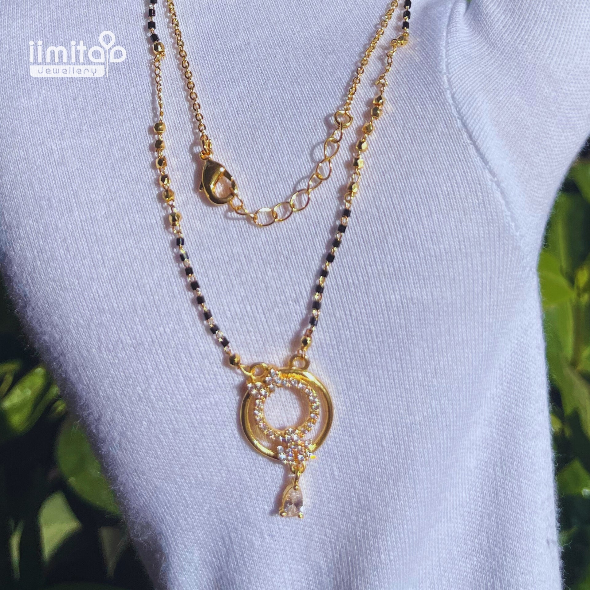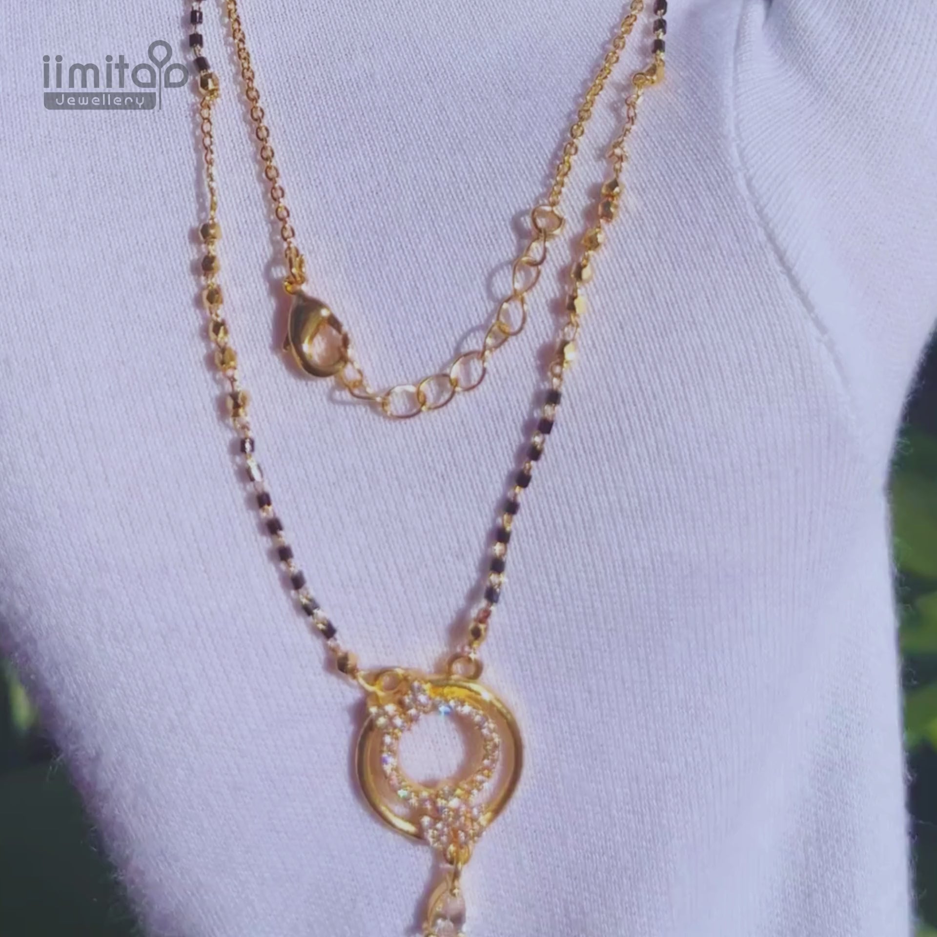 Add a radiant touch to your traditional look with this beautifully crafted gold-toned imitation mangalsutra. Featuring a sleek dual-chain with classic black beads and a designer circular pendant encrusted with sparkling stones, this piece blends timeless tradition with a modern aesthetic. A delicate teardrop dangler adds movement and elegance to the pendant, making it a standout accessory for any occasion.