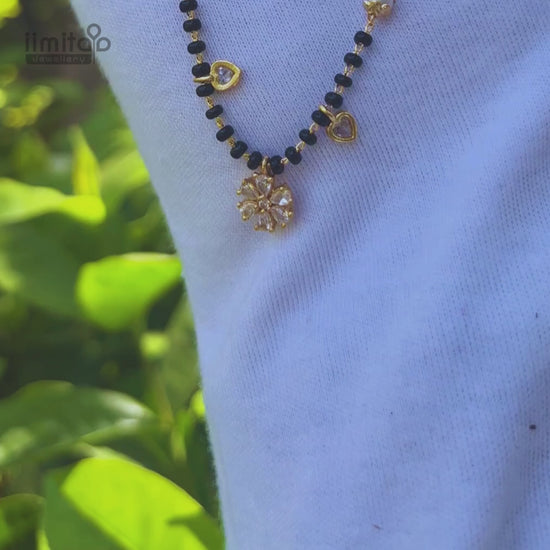 Capture timeless elegance with this beautifully designed gold-plated imitation mangalsutra. Adorned with a classic black bead chain and enhanced by pearl-like side beads, it features a sparkling floral pendant paired with two lovely heart-shaped charms for added grace and symbolism. The intricate craftsmanship and modern flair make it a standout piece for everyday wear or special occasions.