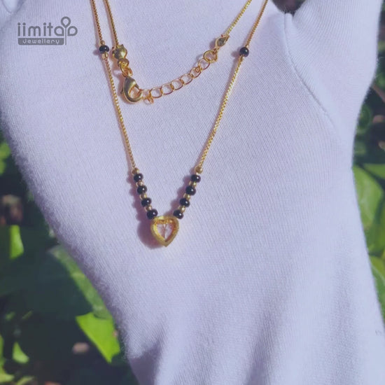 Showcase your love and tradition with this dainty gold-plated imitation mangalsutra featuring a charming heart-shaped pendant encrusted with tiny stones. The design is completed with a classic double-layer chain—one plain and one detailed with black beads—creating the perfect blend of modern elegance and cultural essence.