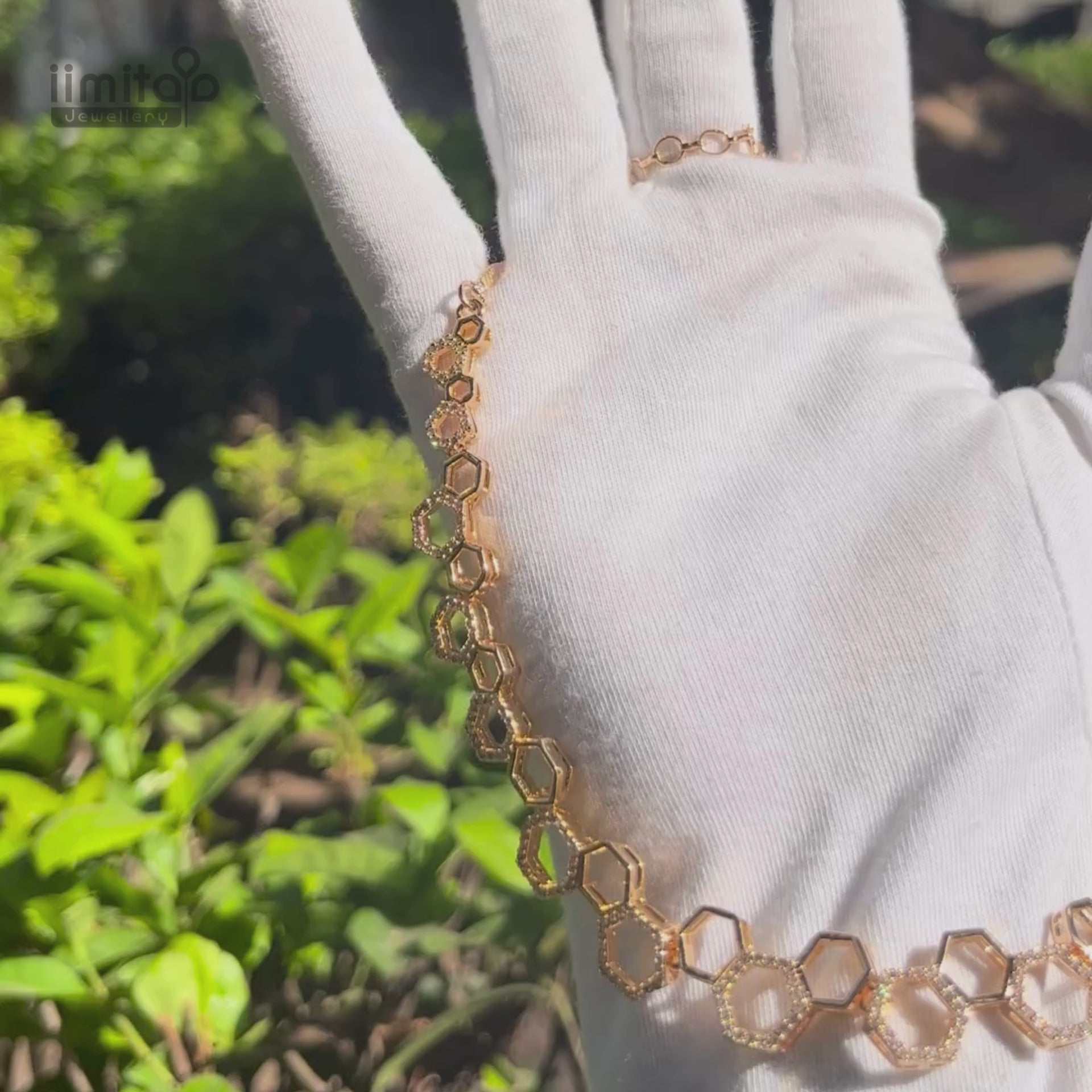 Elevate your elegance with the HexaGlow Sparkle Set – a stunning imitation jewellery design crafted to radiate brilliance without the cost of real gold. This set features a necklace and matching earrings adorned with hexagon-shaped motifs, intricately designed with shimmering American diamonds that catch the light beautifully.