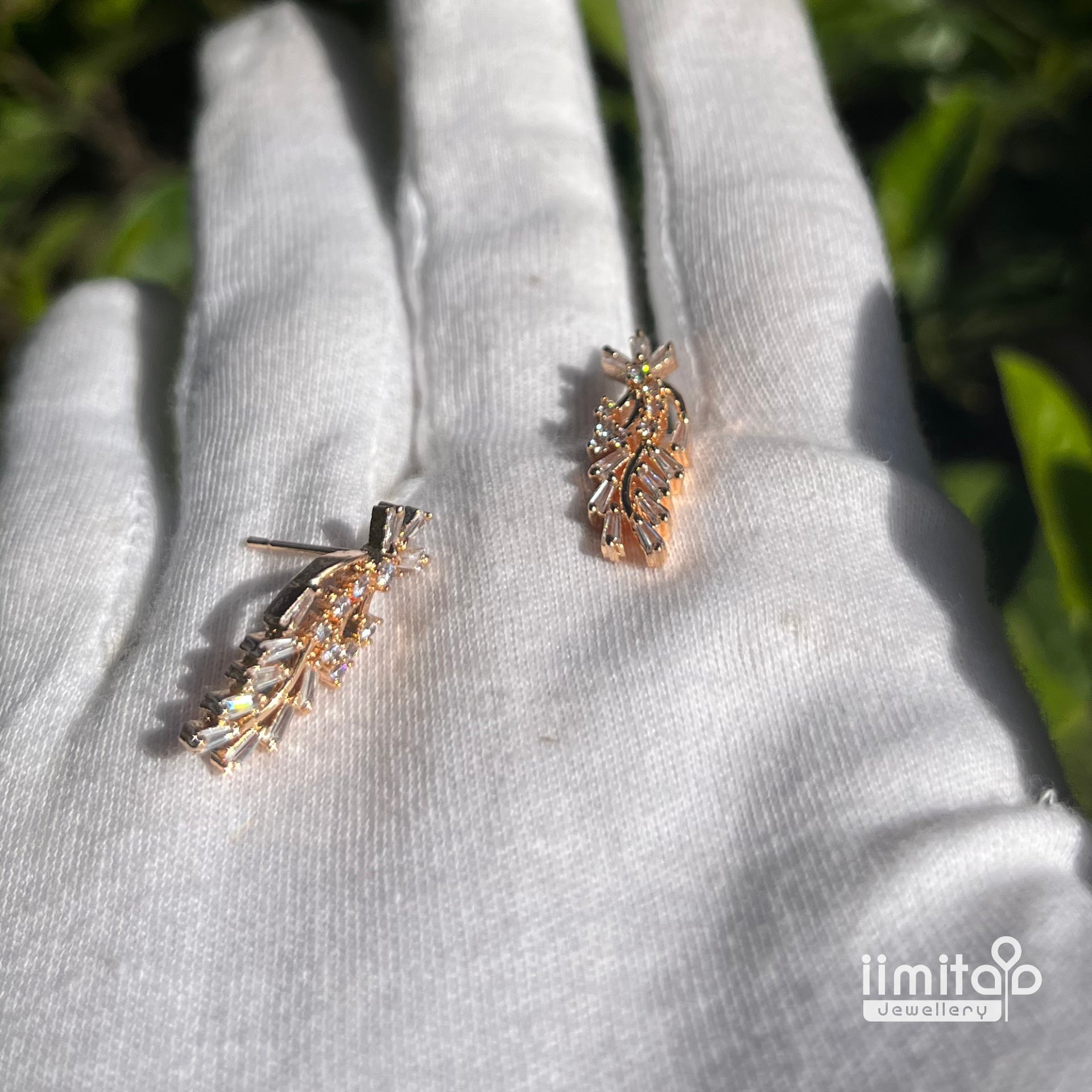 The design features a unique arrangement of baguette and marquise-cut stones set in a rose gold-toned base, offering a modern yet timeless appeal. Paired with matching lightweight earrings, this imitation set is ideal for festive occasions, parties, weddings, or as a standout piece for your special day.